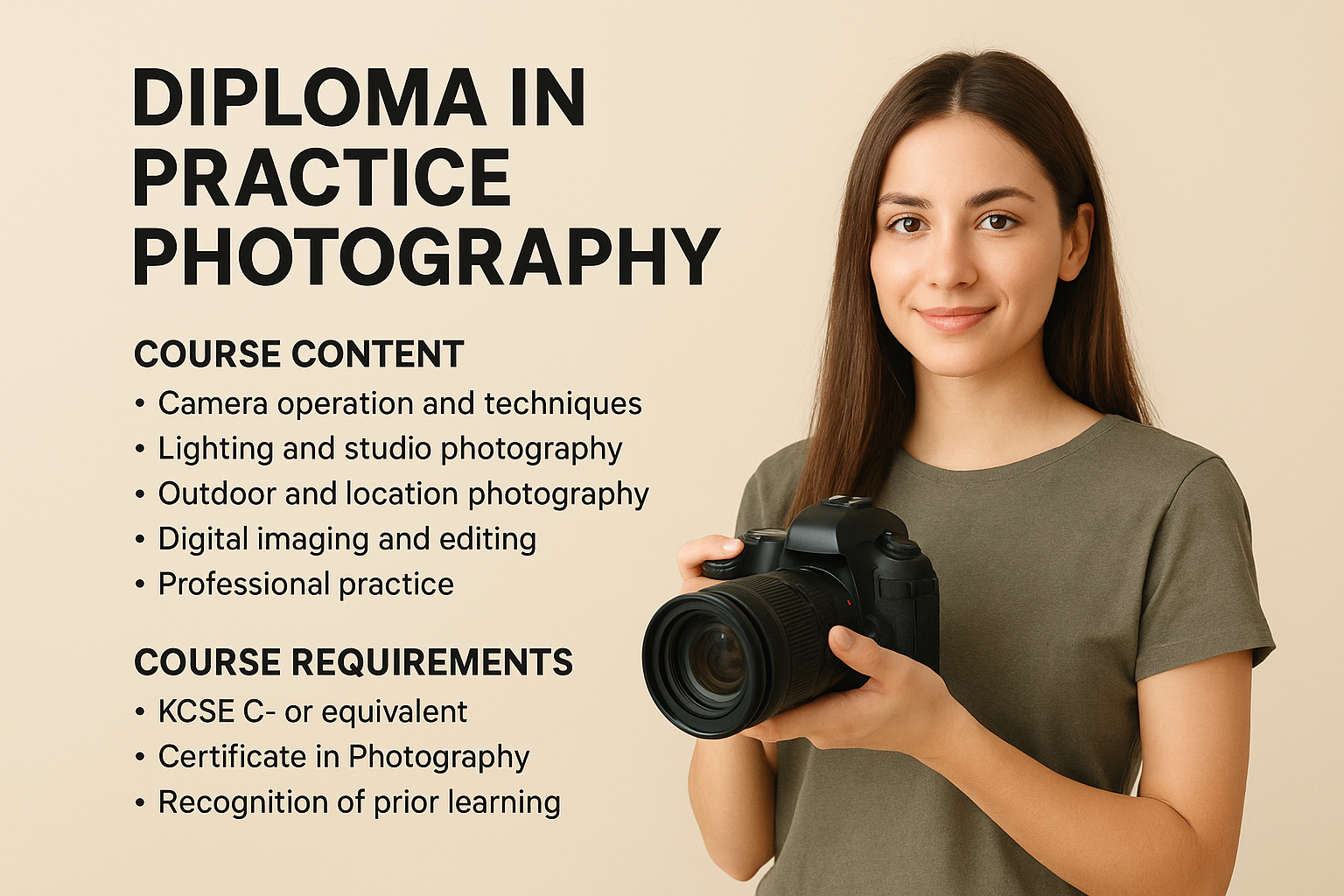 The Diploma in Practice Photography is a two-year, skills-based programme designed to train learners in professional photography techniques, digital imaging, visual storytelling, and studio operations. The course combines theoretical knowledge with intensive hands-on practice in camera handling, lighting, photo editing, and creative composition.